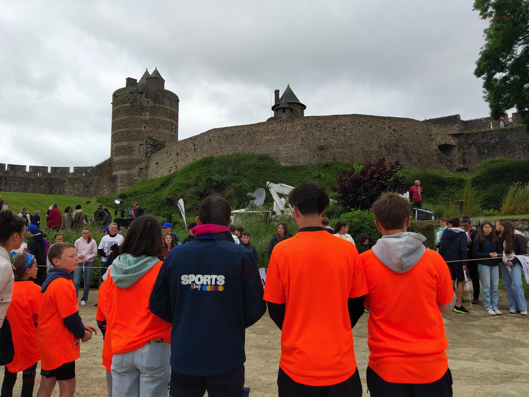 Accompagnés de quatre élèves du lycée JBLT et des autres délégations des établissements scolaires et des dirigeants des clubs sportifs de Fougères, nous avons effectué une haie d’honneur pour la première relayeuse, place Raoul II avant de réitérer, pour la dernière relayeuse, dans l’enceinte du château.