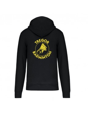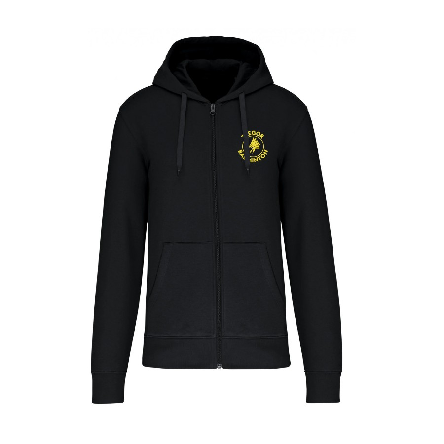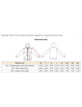 Sweat Homme 85% coton biologique / 15% polyester recyclé post-consumer. Surface extérieure 100% coton. Molleton gratté 3 fils LSF (Low Shrinkage Fleece). Coton peigné. Lavage aux enzymes. Coupe droite. Poches kangourou. Fermeture zippée nylon ton sur ton. Capuche doublée 100% coton, coton jersey 180g. Bord-côte 1x1 montage tubulaire pour une meilleure finition au bas de manches et de vêtement. Bande de propreté jersey ton sur ton et finition demi-lune intérieur col. Finition double aiguilles sur bas de manches, bas de vêtement et col. Pas d'étiquette de marque au col, juste une puce de taille pour faciliter la personnalisation.