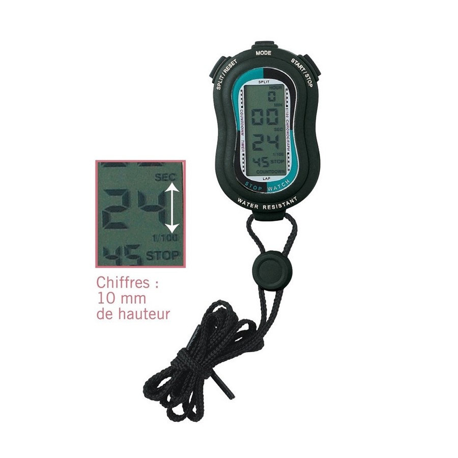 Précision 1/100 sec, temps simple, addition de temps, split, sonnerie start/stop, gros caractères 10 mm, compte-à-rebours, résistant à l'eau, aux chocs, piles alkaline. Livré avec pile.