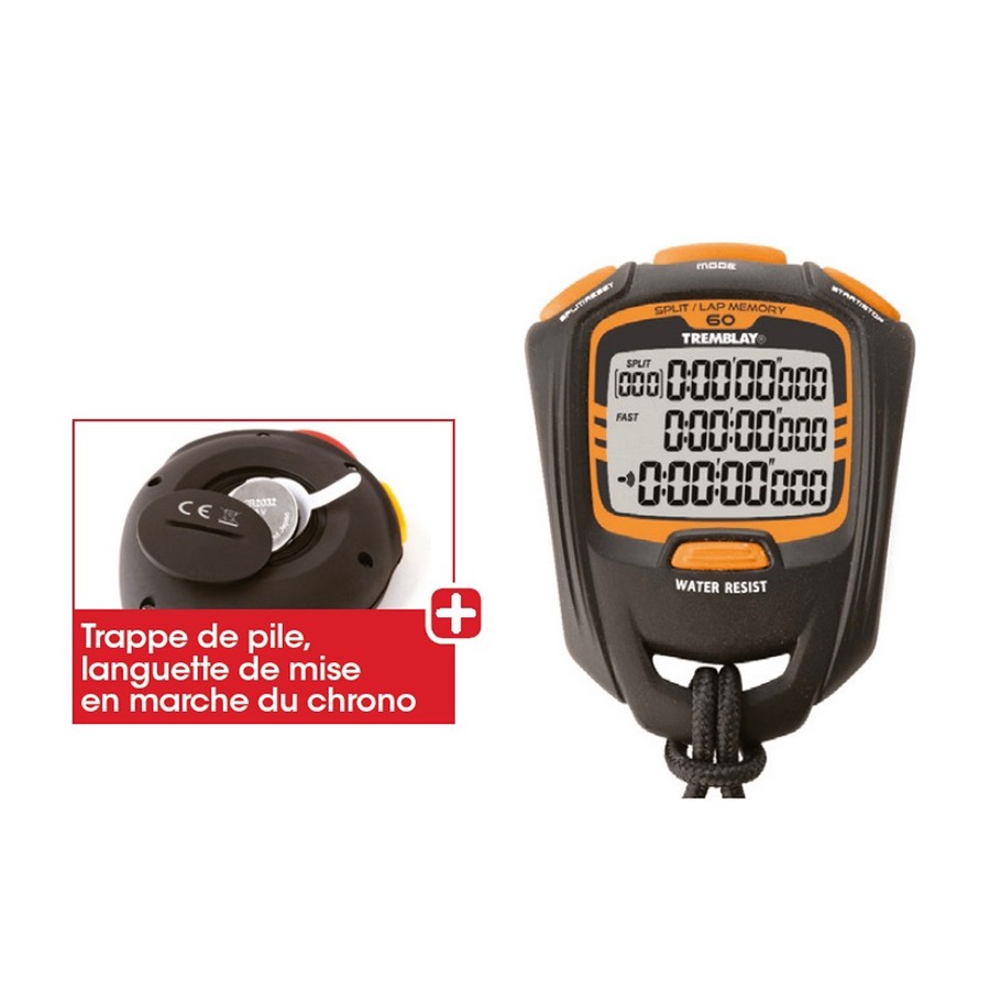 60 mémoires. 1/1000e , temps simple, addition de temps, split, sonnerie start/stop, double alarme, heure, calendrier, compte à rebours répétitif, minuterie d'intervalles, pacer, compteur d'impulsion, calcul du temps le plus rapide, le plus lent et de la moyenne. Résistance à l'eau et aux chocs, piles lithium inclus.