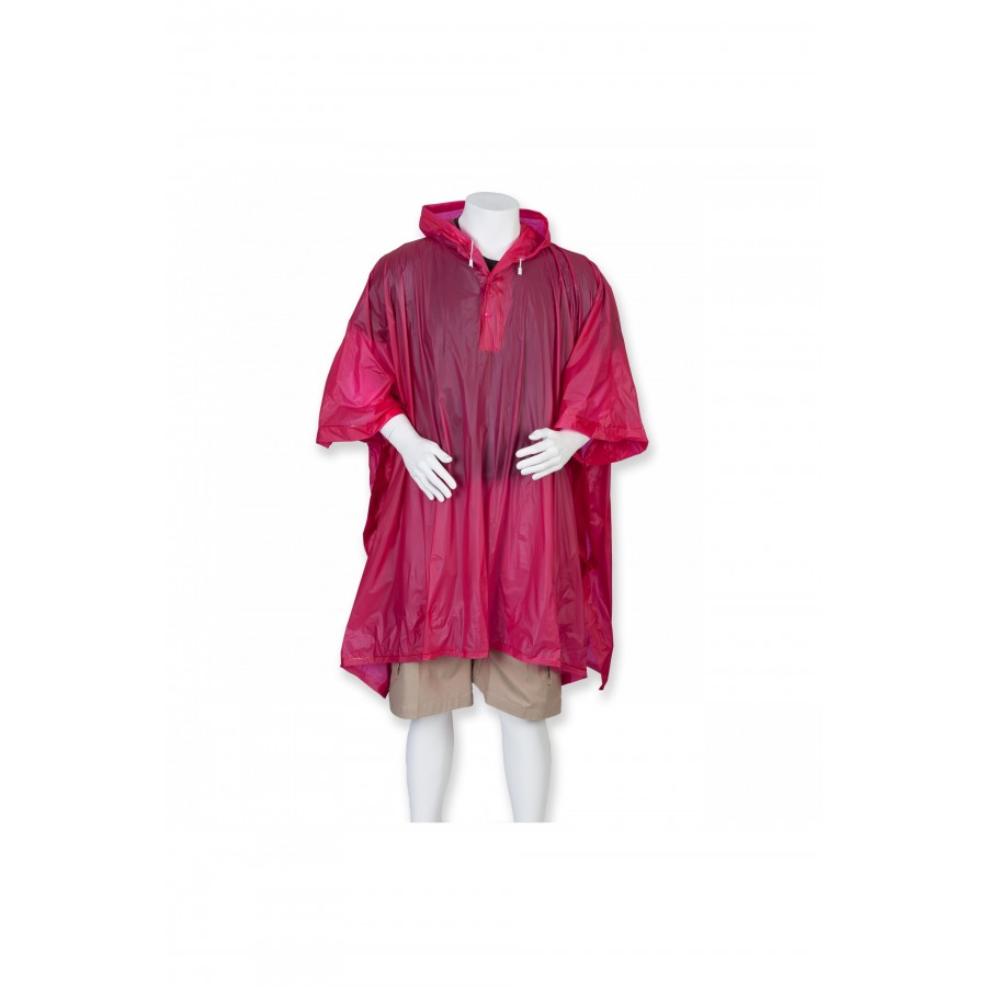 100 % PVC. Poncho avec col à boutons pression. Peut être replié sur lui-même dans sa pochette. Capuche à cordon de serrage. Imperméable et coupe-vent, il peut également se poser pour se protéger d'un sol humide.