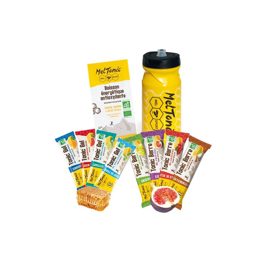 Découvrez un pack de nutrition sportive alliant plaisir et performance. L'alimentation est à la base de tous les sports et elle est indispensable pour la réussite d'une compétition ou d'un entrainement. De plus, elle est nécessaire à tous niveaux. A l'écoute des sportifs, Meltonic a crée un pack découverte composé de produits sains et formulés avec du miel. Une alternative naturelle aux produits présents sur le marché. Pour découvrir pleinement les produits Meltonic qu'un pack reprenant des gels, des barres et une boisson énergétique est idéal. 4 Barres énergétiques Bio : Facile à manger grâce à leurs formats de 25g, les barres énergétiques bio allient un goût délicieux à un apport d'énergie naturelle. Raisins BIO, Baies de Goji BIO, Figues BIO, Pistaches & Fleur de sel de Guérance BIO. 4 gels énergétiques : des gels énergétiques 100% Français à base de miel d'acacia Bio et de plantes toniques & huiles essentielles, ils permettent de couvrir les besoins de toute une course : 1 gel Coup de Boost, Un gel endurance BIO, un gel Antioxydant BIO, un gel Coup de Frais BIO. 1 sachet de boisson énergétique antioxydante BIO Fruits rouges : L'alimentation en course ne peut se faire sans une bonne hydratation ! Pour une utilisation optimale en course, Meltonic vous offre un bidon sport Zefal 650ml !