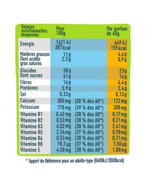 Ingrédients :raisins secs (raisins, huile de tournesol), pommes déshydratées (pommes, conservateur : sulfites), bananes séchées 16%, pâtes de dattes, mélange de graines 6,5% (tournesol décortiqué, courge grillée non salée, lin brun taosté), amandes décortiquées 5,5%, fibres d'acacia, noix de cajou 5,0%, morceaux de chocolat noir 5,0% (sucre, pâte de cacao, beurre de cacao), farine de bananes vertes, fibres de citron, sel, phosphates de potassium et de calcium, vitamines (B1, B2, B3, B5, B6, B8, E) Peut contenir oeuf, lait, sésame, soja et autres fruits à coque.