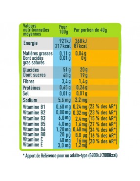 Ingrédients : cassis (purée et jus) 40%, sucre, sirop de glucose-fructose, betterave 10%, gélifiant: pectines de fruits, épaississant: farine de graines de caroube, jus concentré d'acérola, jus de citrons concentré, vitamines (B1, B2, B3, B5, B6, B8, E).